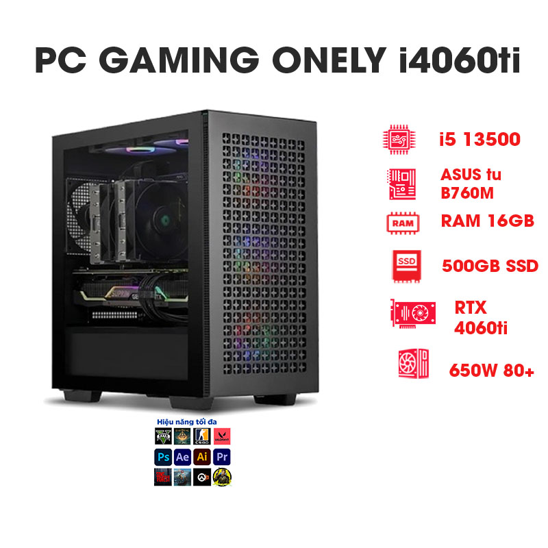 Hiệu năng của những chiếc PC Gaming i4060ti được đảm bảo bởi chip xử lý Core™ I5 13500 với xung nhịp 3.5GHz cùng khả năng tăng tốc lên đến 4.6Ghz. Nhờ mainboard đến từ thương hiệu ASUS B760M PRO RS/D4 WiFi những chiếc PC này có khả năng hoạt động liền mạch. Cũng vì vậy các thao tác được xử lý mượt mà không chút giật lag làm gián đoạn đến công việc của người dùng.